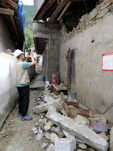 瀘定線科考組(曲哲、朱柏潔)主要考察了得妥鎮、磨西鎮典型建筑地震損傷情況,建筑類型包括木結構、底框結構、框架結構等。如位于九度區的得妥鎮北頭村2座典型的木結構,分別為石-木結構和穿斗木結構,前者震害程度大于后者。得妥鎮政府辦公樓為三層框架結構,填充墻產生交叉斜裂縫,非結構構件破壞嚴重。同時還考察了山體滑坡情況,如得妥渡河隧道口發生多處山體滑坡,掩埋了部分公路。