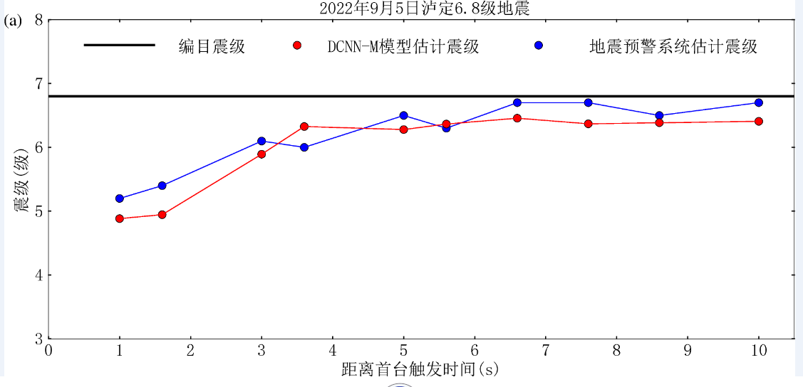圖3展示了人工智能DCNN-M震級(jí)估算結(jié)果隨時(shí)間變化的過(guò)程,可以看到,在此次瀘定6.8級(jí)地震中,首臺(tái)觸發(fā)后1秒人工智能與傳統(tǒng)震級(jí)估算模型都可以給出震級(jí)估算結(jié)果,首臺(tái)觸發(fā)2秒后人工智能震級(jí)估算結(jié)果上升速率較傳統(tǒng)震級(jí)估算模型更快,首臺(tái)觸發(fā)后3.5秒人工智能震級(jí)估算結(jié)果為6.2級(jí)、較傳統(tǒng)震級(jí)估算模型更接近編目震級(jí),隨后人工智能震級(jí)估算結(jié)果知道首臺(tái)觸發(fā)后10秒都穩(wěn)定在6.3級(jí),與傳統(tǒng)震級(jí)估算模型相當(dāng)。