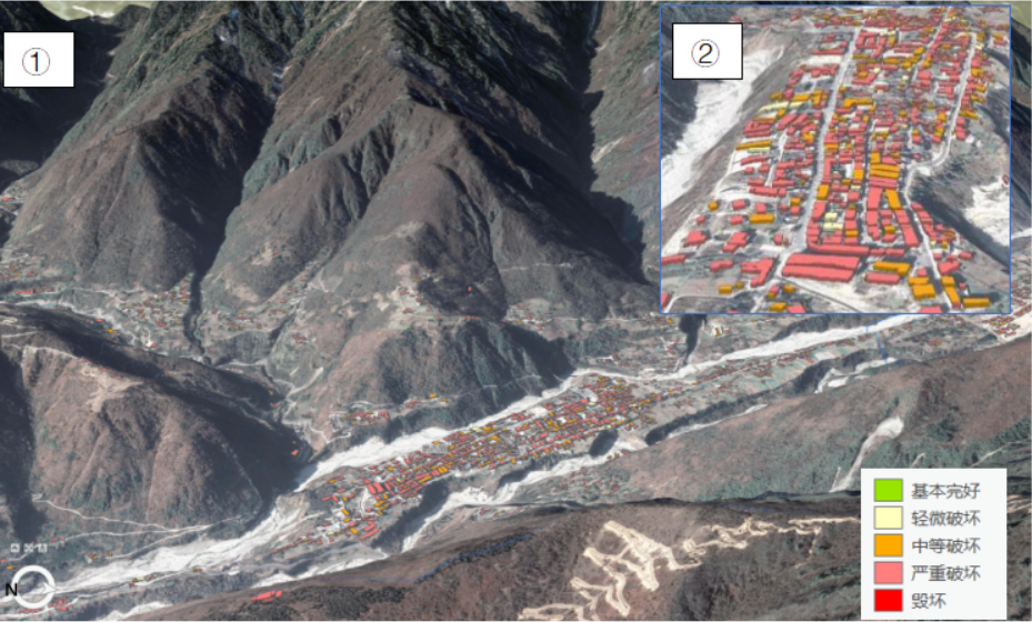 圖3 災區建筑物震害評估結果(磨西鎮及其周邊,①為全景,②為放大圖)