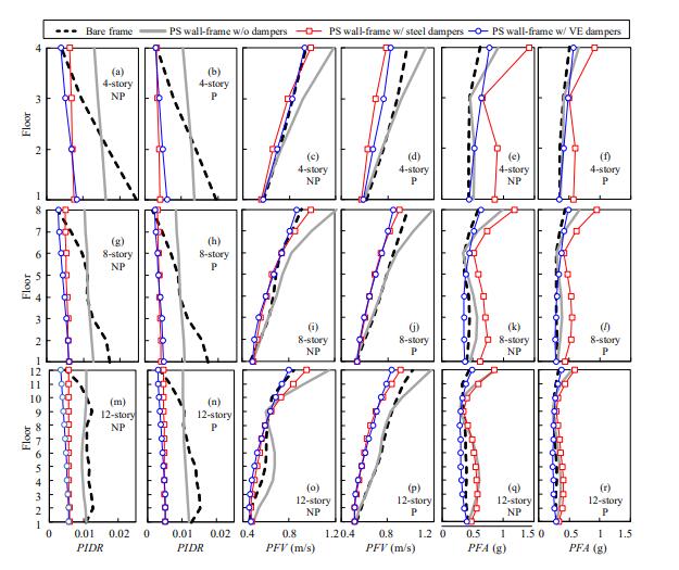鉸支墻可以增加結(jié)構(gòu)沿高度方向的連續(xù)剛度并使層間位移分布更為均勻,從而避免框架結(jié)構(gòu)出現(xiàn)薄弱層破壞。然而,現(xiàn)有研究對(duì)鉸支墻-框架結(jié)構(gòu)的樓面速度和加速度反應(yīng)關(guān)注較少,而這些反應(yīng)主導(dǎo)了建筑物非結(jié)構(gòu)構(gòu)件的地震損傷。本文通過數(shù)值模擬評(píng)估了鉸支墻-框架結(jié)構(gòu)的樓面速度和加速度反應(yīng),重點(diǎn)研究了使用不同類型阻尼器對(duì)其的影響。此外,還通過結(jié)合最大峰值層間位移角、平均峰值樓面速度和平均峰值樓面加速度作為工程需求參數(shù)進(jìn)行了多維地震易損性分析。