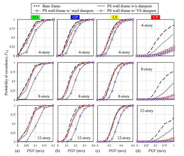 本文通過非線性時(shí)程分析和多維地震易損性分析,研究了兩種阻尼器(即摩擦型阻尼器和黏彈性阻尼器)在減小鉸支墻-框架結(jié)構(gòu)層間位移、樓面速度和加速度地震反應(yīng)中的作用。可以得到以下結(jié)論: