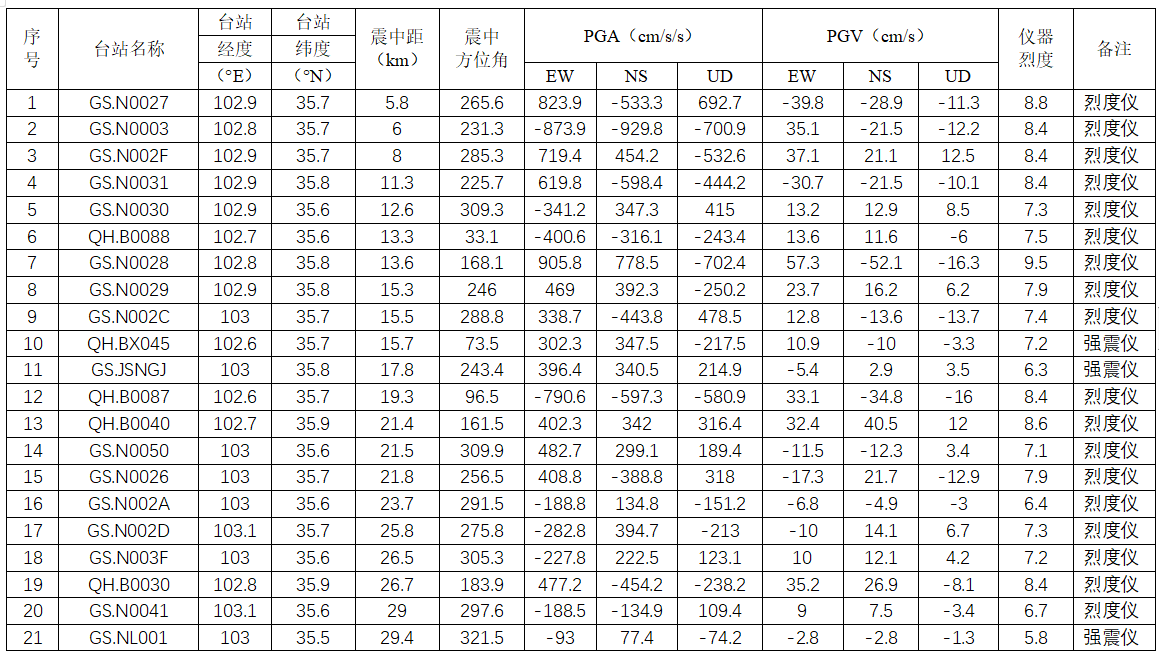 表1甘肅臨夏6.2級地震強震動記錄分析