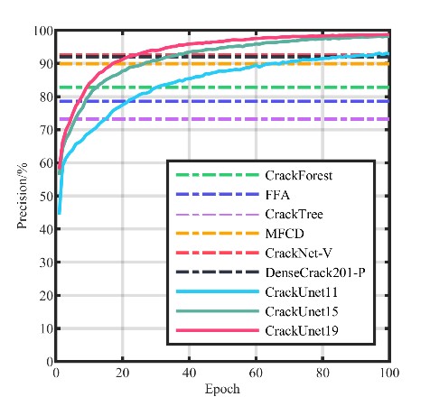 在混凝土結(jié)構(gòu)的服役周期內(nèi),表面裂縫是一種評(píng)價(jià)混凝土結(jié)構(gòu)健康狀態(tài)的重要指標(biāo)。但是無(wú)論是在實(shí)驗(yàn)室中還是在實(shí)際工程中,識(shí)別裂縫都是一項(xiàng)非常復(fù)雜的任務(wù)。而人工識(shí)別裂縫存在著各種缺陷,包括耗費(fèi)時(shí)間長(zhǎng)、評(píng)估主觀等。隨著計(jì)算機(jī)視覺(jué)技術(shù)的發(fā)展,使用計(jì)算機(jī)視覺(jué)技術(shù)自動(dòng)話(huà)地識(shí)別混凝土裂縫成為當(dāng)下研究的熱點(diǎn)。但是計(jì)算機(jī)視覺(jué)識(shí)別裂縫依然存在一些問(wèn)題,包括無(wú)法實(shí)現(xiàn)像素級(jí)的檢測(cè),檢測(cè)精度不高等問(wèn)題。