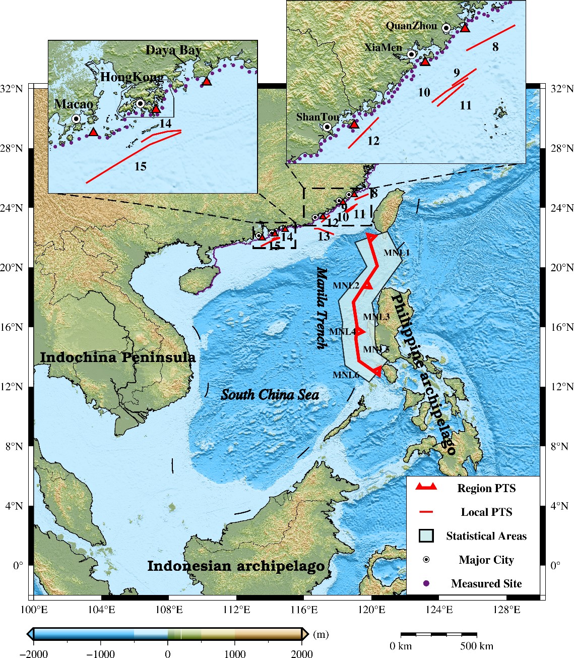 圖1 對(duì)中國(guó)東南沿海有影響的潛在海嘯源