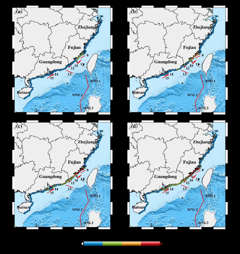 圖3 以(a)475、(b)975、(c)2475、(d)4975年重現(xiàn)期海嘯波高為強(qiáng)度指標(biāo)的中國(guó)東南沿海海嘯危險(xiǎn)性圖