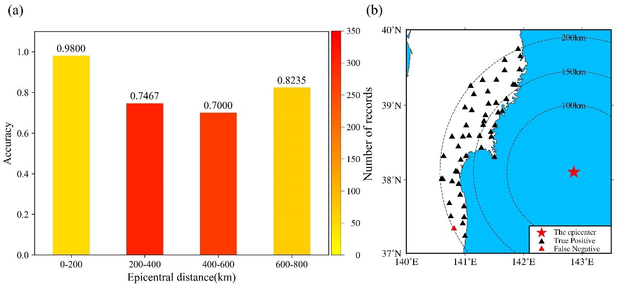 圖3 (a)日本“311”地震數據集中,模型分類準確率與震中距的關系 (b)日本“311”地震數據集中,震中距≤200公里的真陽性和假陰性記錄位置
