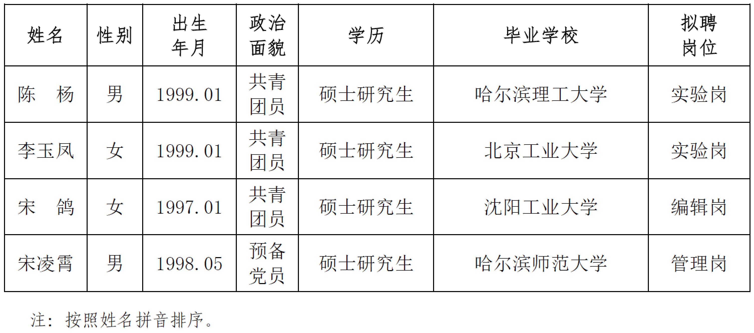 發(fā)布時(shí)間: 2024-05-14 點(diǎn)擊數(shù)量:17433根據(jù)中國(guó)地震局《關(guān)于貫徹執(zhí)行〈事業(yè)單位公開(kāi)招聘人員暫行規(guī)定〉的通知》文件精神和我所用人計(jì)劃,經(jīng)公開(kāi)發(fā)布招聘信息、資格審查、面試等程序確定擬錄人員。現(xiàn)將擬錄人員相關(guān)情況公示如下,公示期7個(gè)工作日,期間如有異議請(qǐng)與中國(guó)地震局工程力學(xué)研究所人才資源部或紀(jì)檢室聯(lián)系,以個(gè)人名義反映情況的領(lǐng)署真實(shí)姓名,以單位名義反映情況的須加蓋公章。