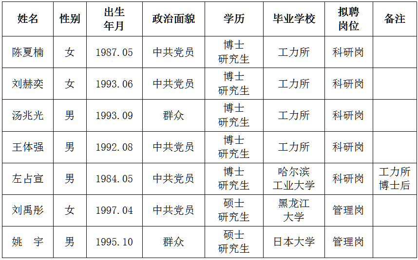 發布時間: 2022-05-30 點擊數量:14662根據中國地震局《關于貫徹執行〈事業單位公開招聘人員暫行規定〉的通知》文件精神和我所用人計劃,經公開發布招聘信息、資格審查、面試等程序確定擬錄人員。現將擬錄人員相關情況公示如下,公示期7天,期間如有異議請與中國地震局工程力學研究所人才資源部或紀檢室聯系,以個人名義反映情況的須署真實姓名,以單位名義反映情況的須加蓋公章。